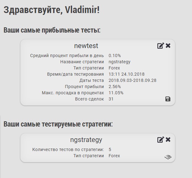 В верхней части будут отображаться результаты ваших тестов, которые лидируют по показателю средней доходности в день (в процентах от депозита). В нижней части идет список стратегий, тестируемых чаще всего. Это выглядит так: