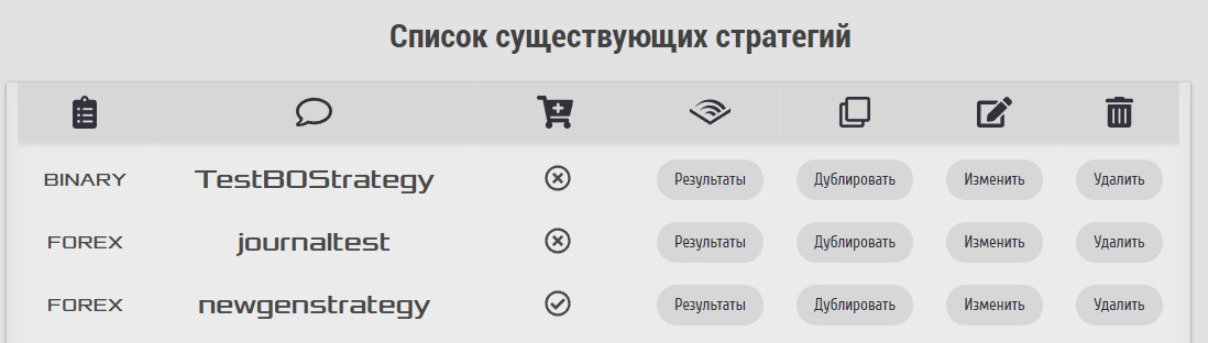 По нажатию на "Добавить новую стратегию" открывается редактор стратегий. Подробно о редакторе можно почитать в других статьях справки. Далее идет "Список созданных стратегий". В нем можно увидеть таблицу управления с созданными стратегиями: