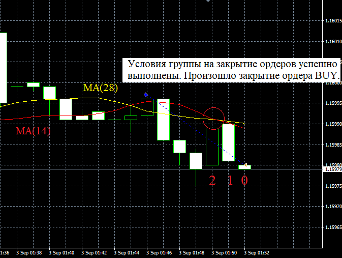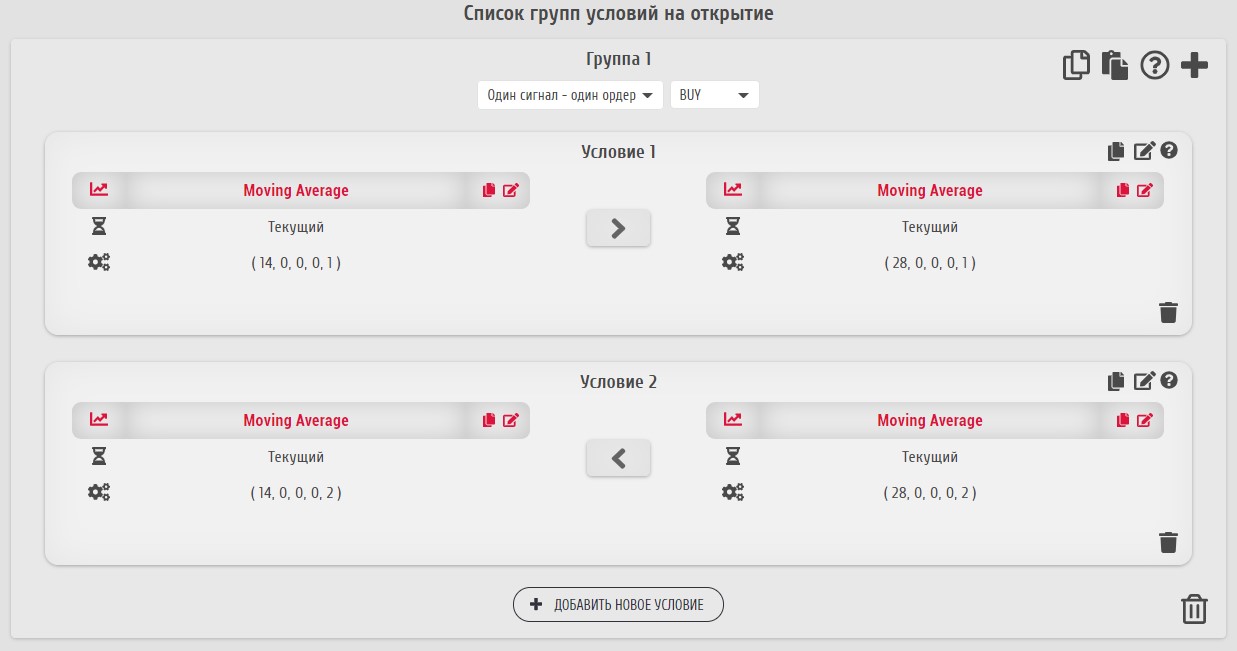 "Создание групп условий открытия" описан пример пересечения "быстрой" и "медленной" MA (Moving Average). На основании данного примера были получены две группы условий открытия. Для BUY-ордеров: