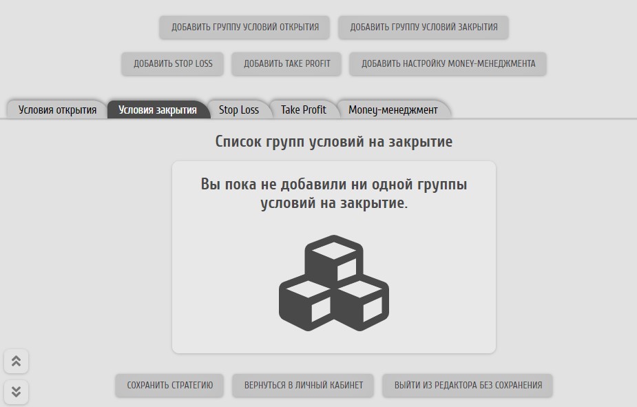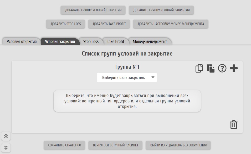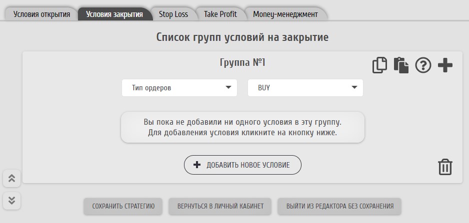 Каждая группа состоит из набора условий, результатом выполнения всех условий группы служит сигнал на закрытие ордеров определенного типа и направления. При необходимости можно создать несколько групп условий закрытия ордеров, каждая из которых будет иметь свой набор условий.Для создания группы условий на закрытие ордеров необходимо открыть в редакторе вкладку "Условия закрытия".