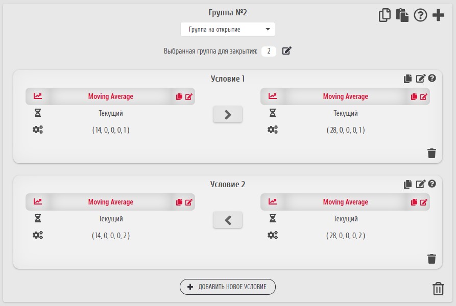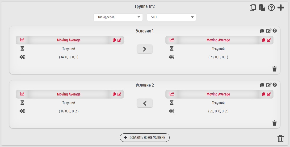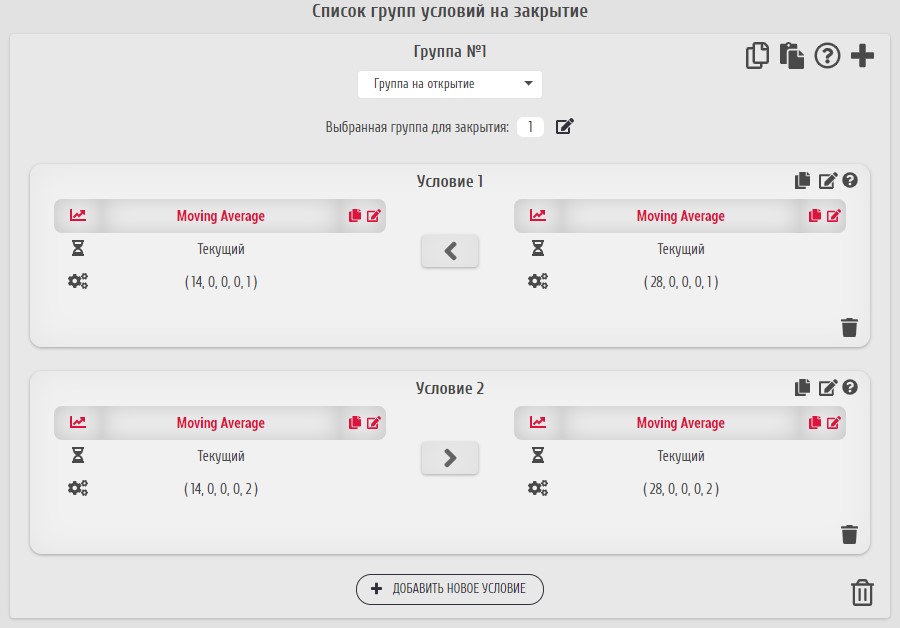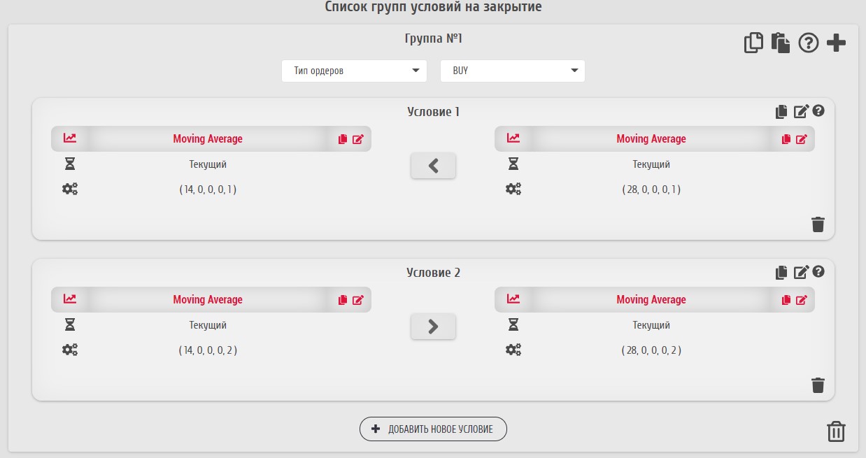 Аналогично создадим группу условий закрытия для SELL-ордеров, исходя из условия примера: