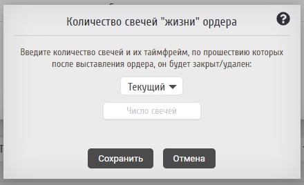 При выборе закрытия по истечению определенного числа минут достаточно будет в появившемся окне просто ввести желаемое время экспирации в минутах. При выборе закрытия по свечам нужно будет кроме числа свечей, которое "проживет" ордер, указать также таймфрейм этих свечей: