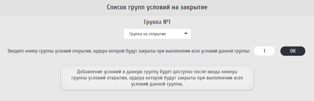 Так же, как и для Forex-стратегий, можно выбрать, что именно будет закрывать каждая группа закрытия. Один из вариантов - закрытие ордеров, открытых определенной группой на открытие. То есть нужно просто выбрать этот пункт и указать номер группы, например, 1. Тогда эта группа закрытия будет закрывать те ордера, которые открыты первой группой на открытие.