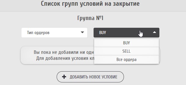 Второй вариант - закрытие по типу ордера. В отличие от Forex-стратегий, здесь нет отложенных ордеров, поэтому можно выбрать только из трех вариантов: BUY, SELL и "Все ордера". Здесь также все просто: при выборе BUY будут закрываться все ставки на повышение, SELL - ставки на понижение, "Все ордера" - будут закрыты все сделки (независимо от того, какая группа эти сделки открыла).