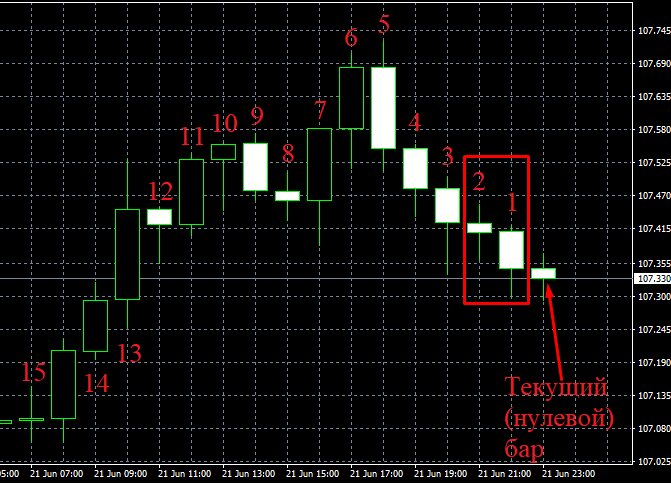 Пересечение линий индикаторов, исходя из примера, будет характеризоваться двумя условиями. Первое условие: на первом баре значение "быстрой" MA должно быть больше значения "медленной". Второе условие: значение "быстрой" MA на втором баре должно быть меньше значения "медленной" МА. Перейдем в терминал и попробуем воссоздать данную ситуацию: