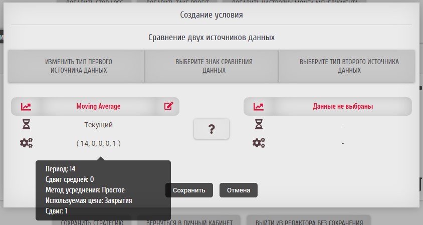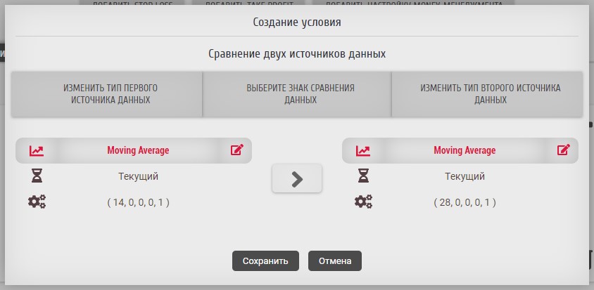 "Сравнение двух источников данных" - он позволяет сравнивать два числовых значения, полученных от различных источников данных. В этом случае нас будет интересовать значение индикатора Moving Average.