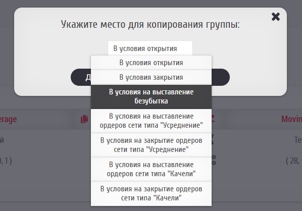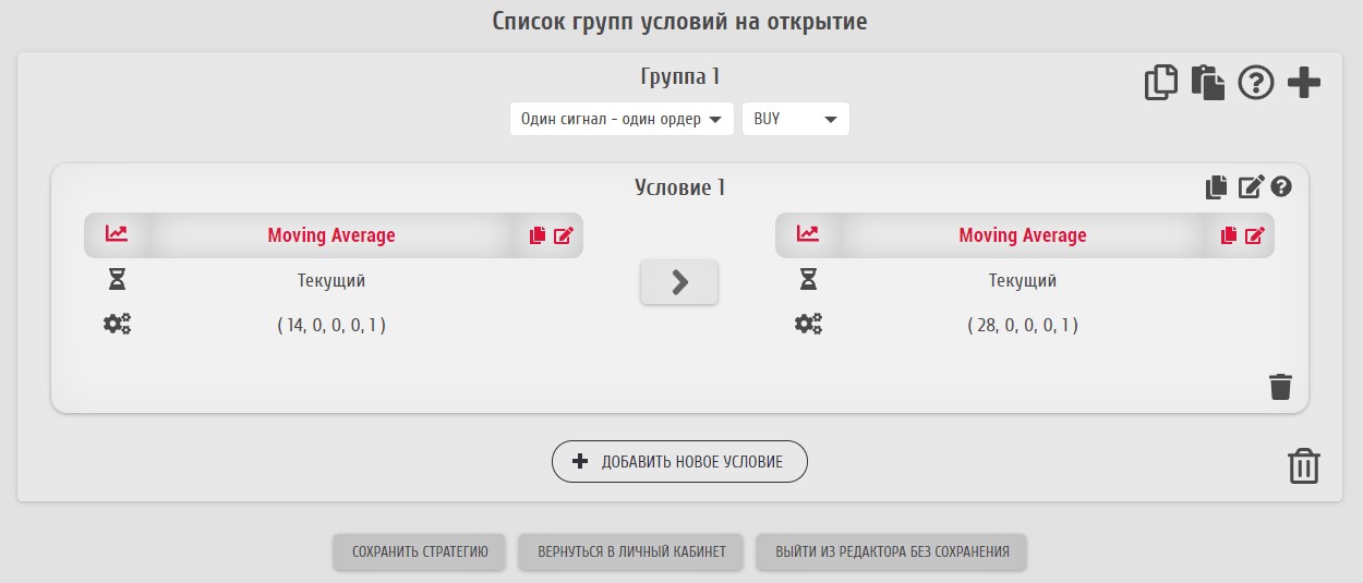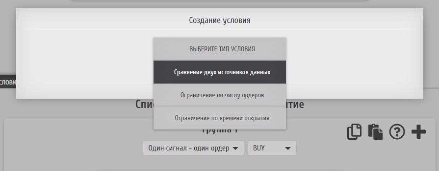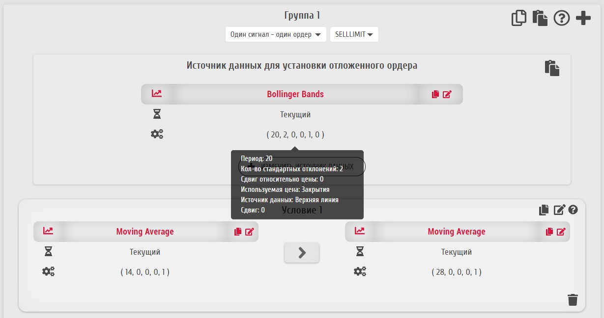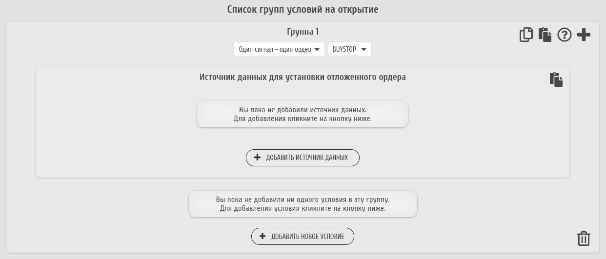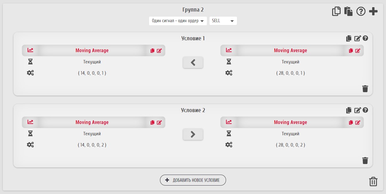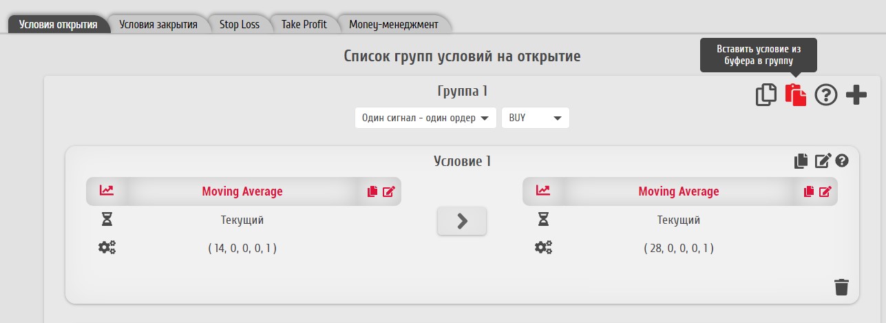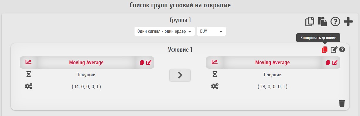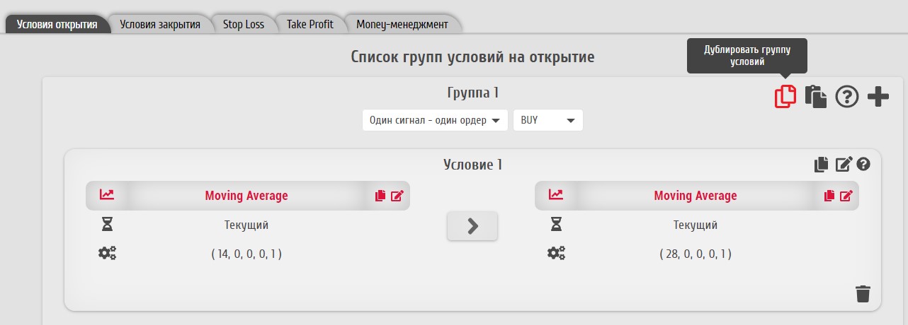 Дублирование группы условий может понадобиться, например, при создании похожих групп открытия и закрытия ордеров разных типов. Для использования данной функции служит иконка "Дублировать группу условий".