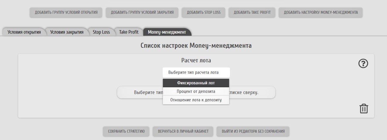 Условия нашего примера успешно заданы. Теперь BUY-ордер (согласно настройкам группы) будет открыт только в тот момент, когда на втором баре "быстрая" МА была ниже медленной, а на первом баре стала выше "медленной". Попробуем воспроизвести данное условие в тестере стратегий, но сначала, помимо условия открытия ордера, обязательно необходимо задать для него расчет лота (объема сделки). Для этого перейдем в рабочую зону "Money-менеджмент". Нажимаем на кнопку "Добавить настройку money-менеджмента" и в выпадающем списке выбираем пункт