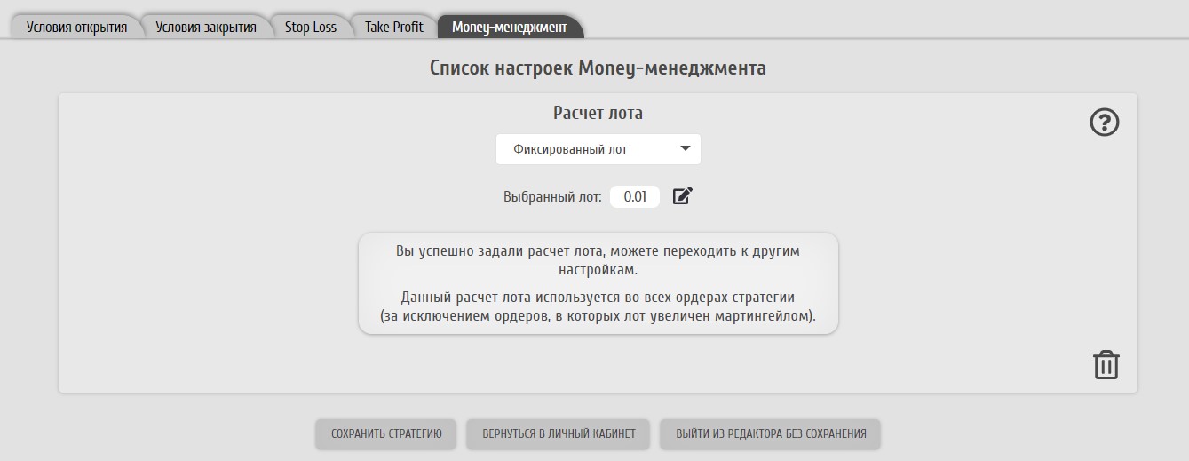 Для примера выберем тип "Фиксированный лот". Введем желаемый лот и закончим настройку.