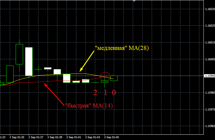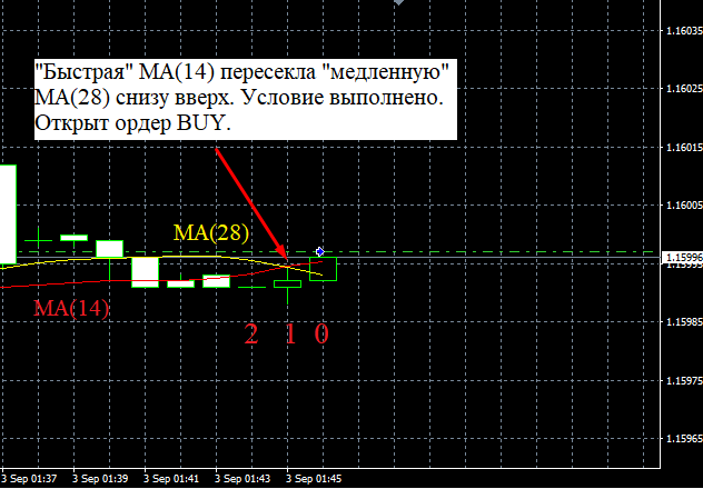 В рамках задачи отследим пересечение "быстрой" MA (с периодом 14) и "медленной" MA (с периодом 28), причем "быстрая" МА пересекает "медленную" МА снизу вверх. Визуально данную ситуацию довольно легко представить, в отличие от ее реализации с помощью логических и математических функций, используемых советником. Для отслеживания пересечения линий двух индикаторов необходимо рассмотреть любой промежуток времени, состоящий из двух стоящих рядом баров (свечей). Для рассматриваемого примера в качестве такого промежутка выберем первый и второй бар (свечу) (нумерация баров (свечей) на графике осуществляется последовательно от текущего (нулевого) бара (свечи) в "прошлое" графика).