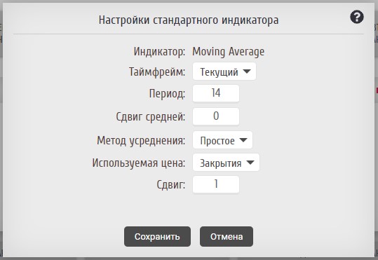 В открывшемся окне задаем параметры индикатора, а именно: "Период" , "Сдвиг средней" и "Сдвиг". Здесь поле "Сдвиг" обозначает номер бара, с которого будет получено значение индикатора MA. В данном случае мы проверяем данные с первого бара, поэтому вводим единицу. "Период" указываем равным 14, "Сдвиг средней" - 0.