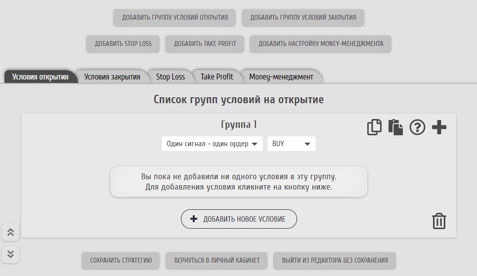 Для создания группы условий на открытие ордера необходимо открыть вкладку "Условия открытия" в редакторе.
