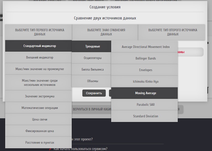 Для полного создания условий сравнения необходимо задать два источника данных и выбрать знак сравнения между ними. В нашем случае первым источником данных будет выступать "быстрая" МА, вторым - "медленная". Добавим первый источник данных ("быстрая" МА). Для этого кликаем по выпадающему списоку "Выберите тип первого источника данных": здесь отобразится большое количество различных источников данных, доступных для сравнения (описание всех источников приведено в справке). Путь к индикатору Moving Average описывается так: "Стандартные индикаторы" - "Трендовые" - "Moving Average".