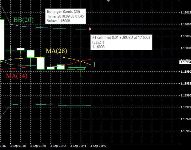 Перейдем в терминал и попробуем отследить открытие ордера SELLLIMIT. Уровень установки данного ордера определит значение индикатора Bollinger Bands на нулевом (текущем) баре.