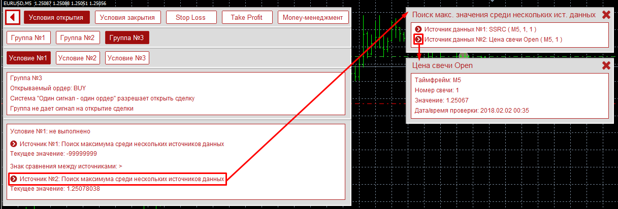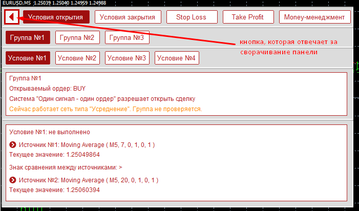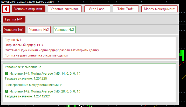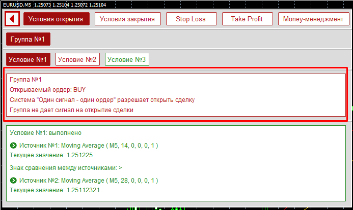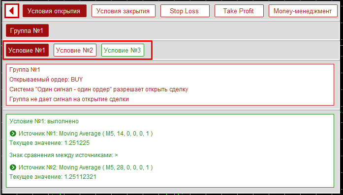 Открыта первая группа условий открытия, и в ней первое условие. Данная панель построена на системе вложенных вкладок: переключение на группы закрытия или money-менеджмент откроет полностью новую информацию, а переключение на другое условие поменяет только блок, на котором отображена информация о выбранном условии. В верхнем текстовом блоке отображена информация о выбранной группе:
