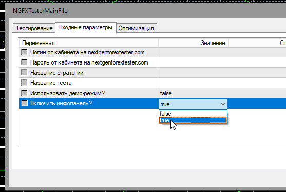 Включается отображение панели в советнике перед запуском теста. Для этого в его настройках нужно в параметре "Включить инфопанель?" указать true: