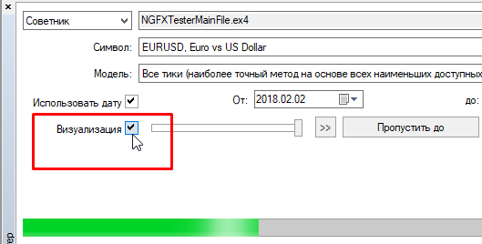 Затем нужно не забыть включить режим визуального тестирования (ведь панель отображается на графике, и нужно сравнивать ее показания с тем, что происходит на рынке в момент тестирования). После этого можно начинать тест.