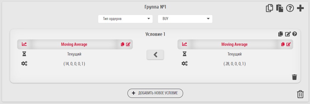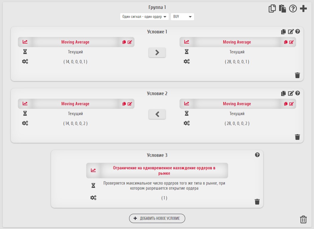 Например, создадим группу условий на открытие, чтобы BUY-ордер открывался по пересечению МА (индикатор Moving Average). Также ограничим число ордеров, чтобы ордеров данного типа могло быть не больше одного. Вот что получается в итоге: