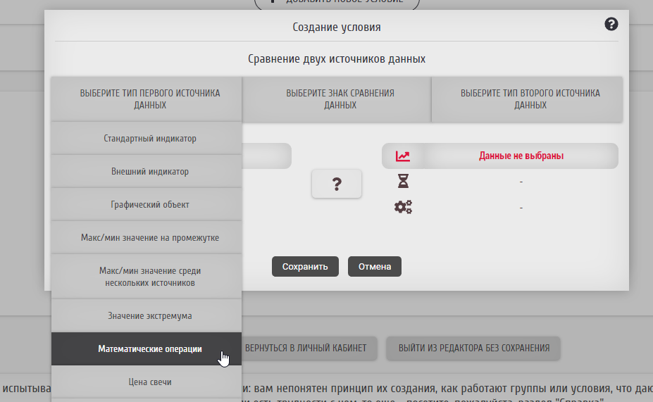 Для начала нужно кликнуть "Добавить условие" в любой группе, а в открывшемся окне выбрать "Сравнение двух источников данных". В качестве первого источника данных следует выбрать "Математические операции":