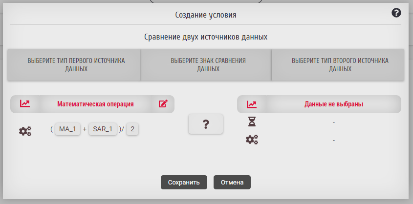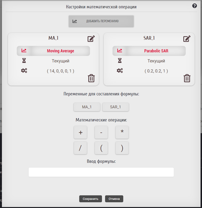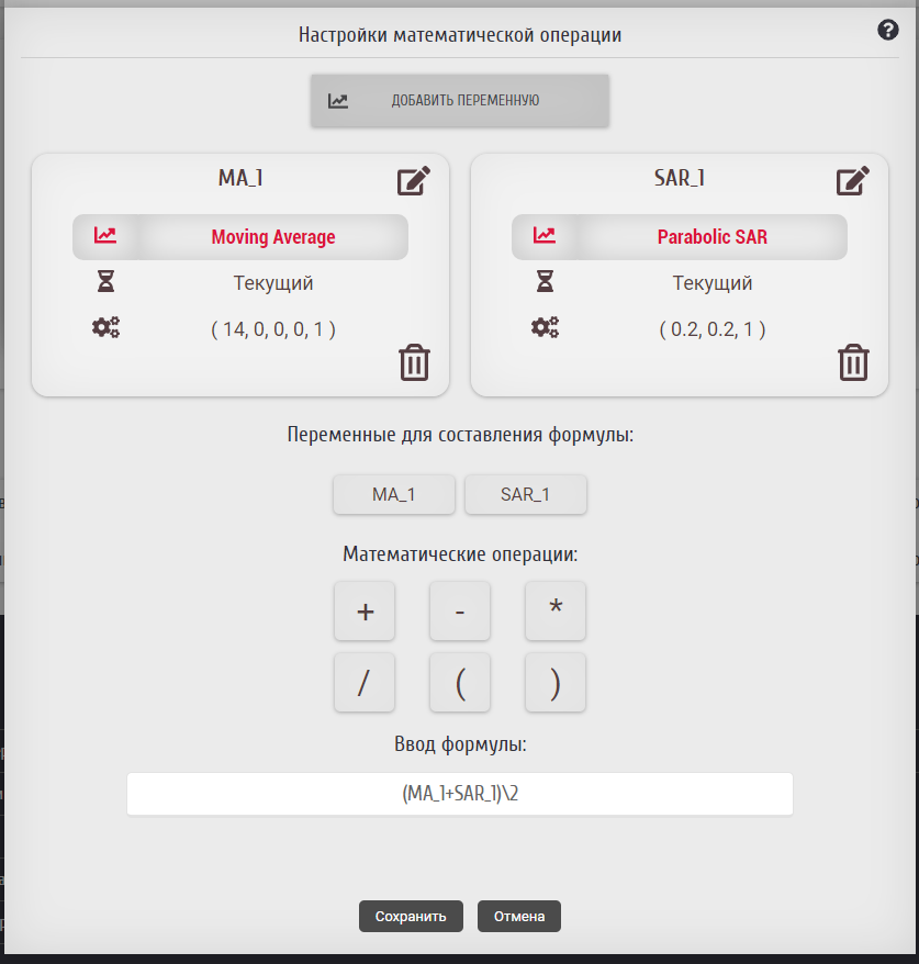 Теперь, когда компоненты формулы добавлены в рабочую зону, нужно написать саму формулу. В первую очередь нужно сложить первый источник данных и второй: последовательно кликнуть на кнопку с переменной MA_1, по знаку плюс, и затем по переменной SAR_1: