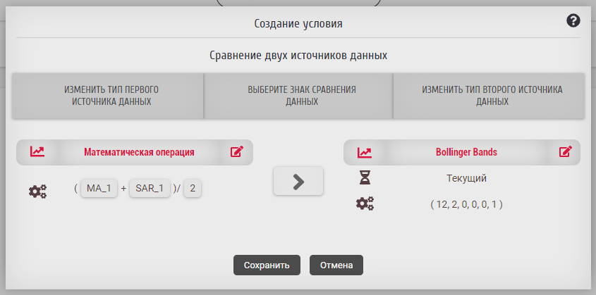 В качестве второго источника данных мы добавили значение средней линии индикатора Bollinger Bands. Теперь, когда результат мат. операции будет больше, чем значение этой линии, условие будет выполнено.