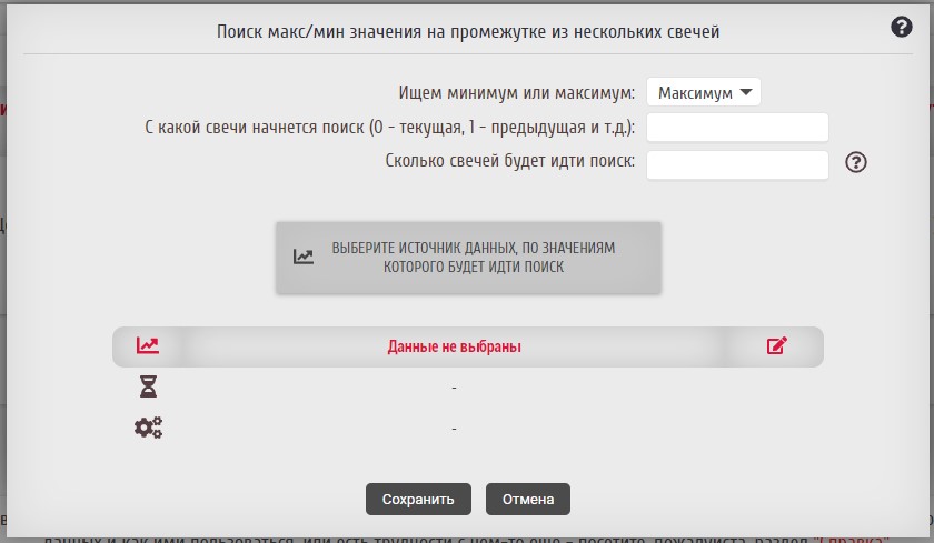 Данный источник позволяет найти максимальное или минимальное значение любого другого источника на заданном промежутке свечей. В окне с настройкой поиска отобразится следующее меню: