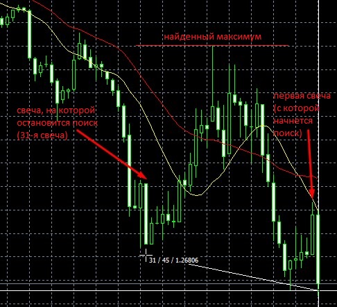 Разберем пример, на котором идет поиск максимального значения по цене High начиная с первой свечи. Длина поиска - 30 свечей (то есть все параметры соответствуют скриншоту выше). Вот как будет происходить поиск в процессе теста: