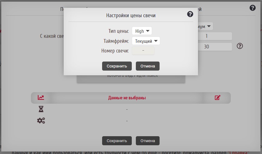 Здесь невозможно задать поле "Номер свечи", т.к. будут проверяться все ценовые значения на промежутке, который указан для поиска.