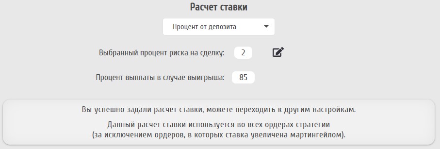 "Расчет ставки" позволяет настроить расчет суммы, которой будет открыта очередная сделка. Варианта всего два - "Фиксированная ставка", когда можно задать сумму, например 10$, и именно ей будут совершаться ставки; а также "Процент от депозита", в котором указывается, какой процент от суммы депозита на момент открытия сделки будет использоваться для совершения ставки. У обоих вариантов есть параметр "Процент выплаты в случае выигрыша". Его можно узнать у брокера, у которого вы собираетесь в будущем торговать стратегией. В зависимости от валютной пары, таймфрейма и самого брокера процент выплаты может варьироваться от 50% до 95%. Вводить желательно максимально приближенное к реальности число, тогда результаты тестирования будут наиболее точными.