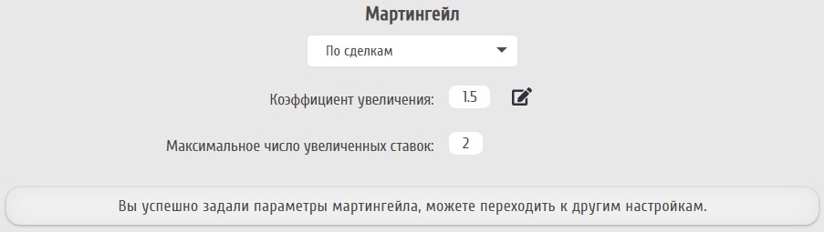 У обоих вариантов одинаковые настройки: "Коэффициент", на которой будет умножена ставка предыдущего ордера, и "Максимальное число увеличений" - при достижении этого числа очередной ордер будет открыт с обычной суммой ставки.