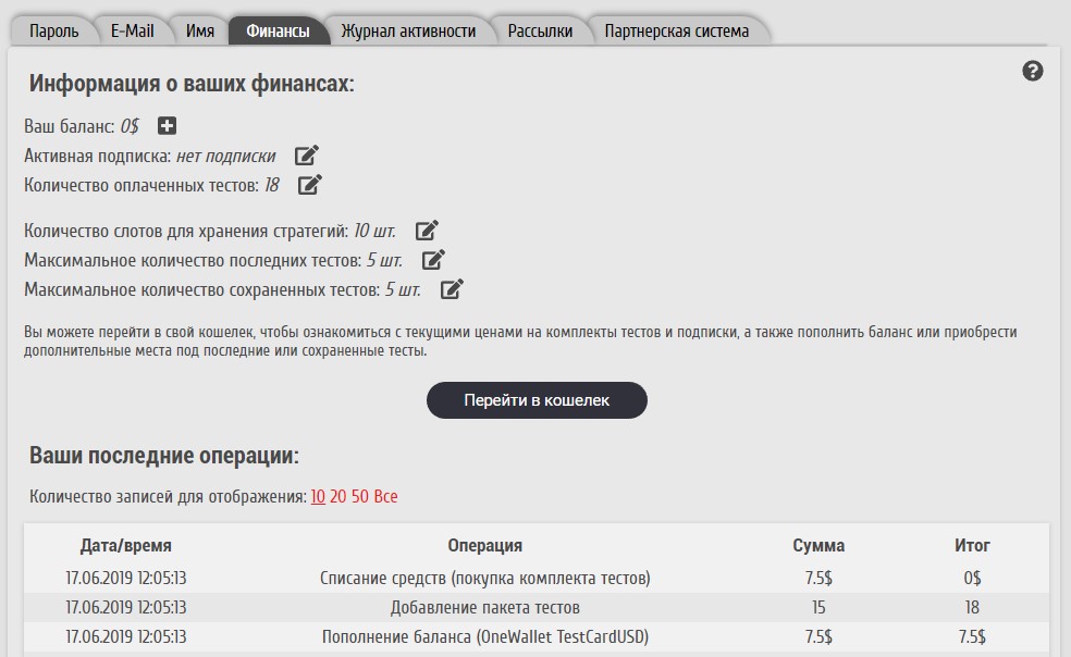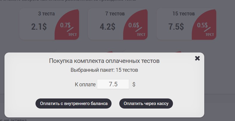 "Кошелек". На открывшейся странице кликаем на любой желаемой функции, например по комплекту из 15 тестов: