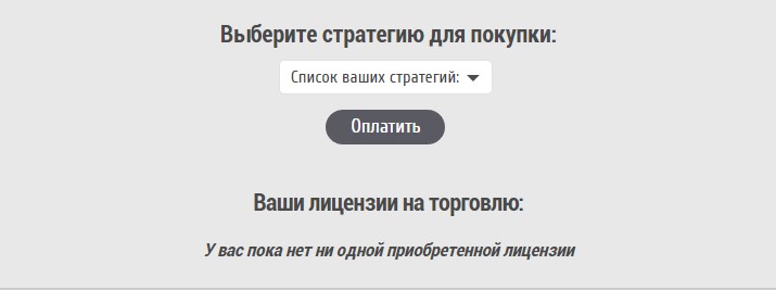 Если вы протестировали стратегию и вам нравится как она работает - просто торгуйте ей на реальном рынке на любом вашем счету без ограничений! Для этого следует выбрать стратегию в выпадающем меню ниже и нажать "Оплатить", после чего следовать инструкциям на экране. После покупки вы получаете лицензию на торговлю данной стратегией в течение года с момента покупки. Покупка лицензии по уже оплаченной стратегии автоматически продлевает ее лицензию на год.