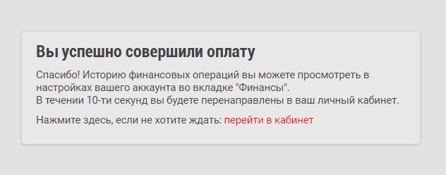 По клику "Оплатить через кассу" откроется окно онлайн-системы приема платежей. Там вам будет предложено выбрать желаемый способ пополнения, после чего, следуя инструкциям, вы сможете завершить оплату. В случае успешного завершения вы будете перенаправлены обратно на наш сайт, где увидите такое сообщение: