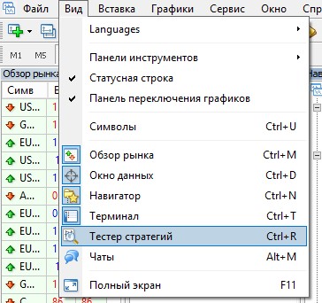 Далее нужно открыть тестер стратегий в терминале (если он конечно у вас уже не открыт). Для этого нажмите вверху в терминале на кнопку "Вид" и поставьте галочку в поле "Тестер стратегий":