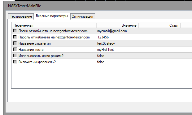 Теперь надо нажать на "Свойства эксперта" в тестере. В открывшемся окне необходимо ввести логин и пароль от кабинета на сайте проекта, а также вставить скопированное ранее название стратегии и ввести название будущего результата теста. Это нужно для того, чтобы в будущем была возможность не потерять результат среди других. Возможно также настроить размер начального депозита на вкладке "Тестирование". Когда все готово, нужно нажать "ОК".