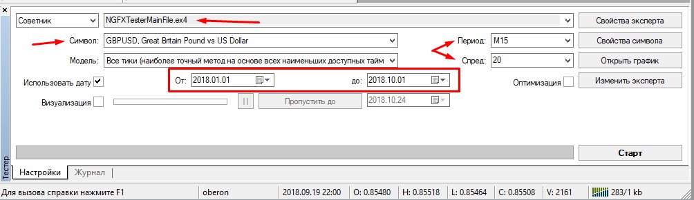 справка). В терминале нужно открыть тестер стратегий, в нем выбрать наш советник, валютную пару, срок тестирования. Также при необходимости можно настроить таймфрейм и размер спреда. В стратегиях по бинарным опционам, разумеется, спред не учитывается, каким бы он ни был.