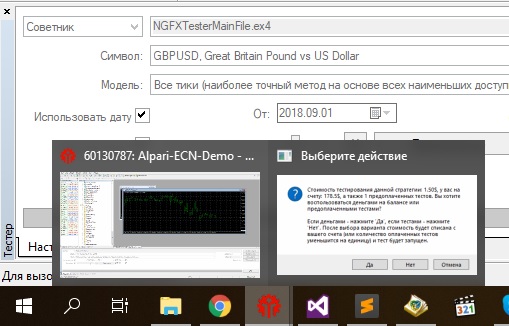 Перед тестом также необходимо загрузить котировки (Кнопка F2 в терминале - выбираете пару - загрузить - ожидание загрузки - снова загрузить - на вопрос о пересчете отвечаете "да" - ожидание - готово).