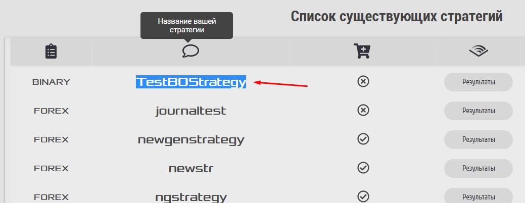 К этому моменту уже должна быть создана стратегия со всеми желаемыми торговыми условиями и функциями. Далее необходимо скопировать название стратегии: нажать Ctrl+C, выделив его в списке стратегий: