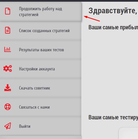 Если же в процессе создания стратегии закрыть страницу с редактором, то при повторном открытии личного кабинета вместо кнопки "Добавить новую стратегию" отобразится кнопка "Продолжить работу над стратегией". Нажав на нее, можно продолжить работу над стратегией с того места, на котором она была прервана: