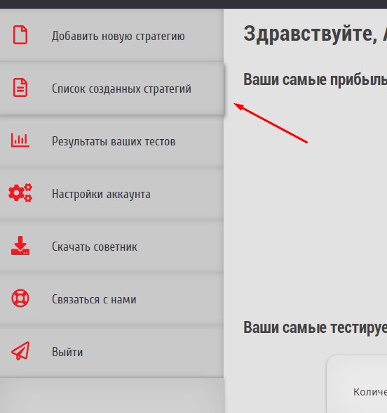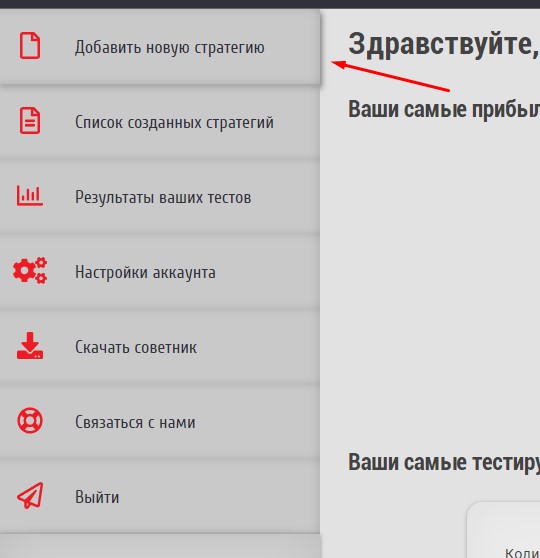 Для создания стратегии следует войти в свой личный кабинет и нажать кнопку "Добавить новую стратегию" в сайдбаре слева: