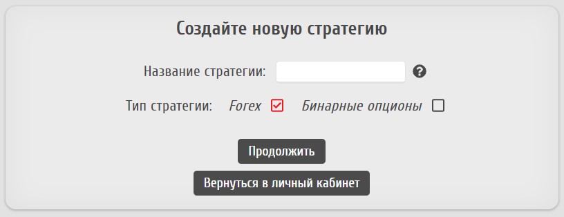 При открытии редактора стратегий отображается окно с вводом названия будущей стратегии и выбором ее типа: