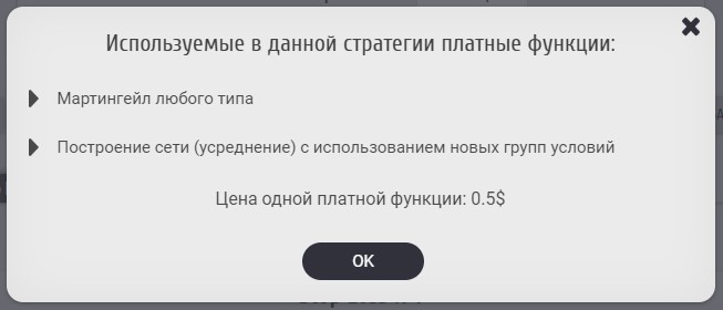 В блоке информации о стратегии можно также настроить "Режим работы": "Раз в бар" или "Каждый тик". В режиме "Раз в бар" все условия будут проверяться только один раз при открытии бара, что значительно ускоряет процесс тестирования. Если же выбрать режим "Каждый тик", то условия будут проверяться каждый тик. Этот режим необходим для индикаторов, с которых берутся данные на нулевом (текущем) баре, а также может пригодиться в некоторых других ситуациях, но в этом режиме тестирование будет происходить значительно медленнее. При нажатии на поле, содержащее цену стратегии, откроется список с перечнем всех платных функций, используемых в данной стратегии. На скриншоте ниже показан вид и содержание данного списка.