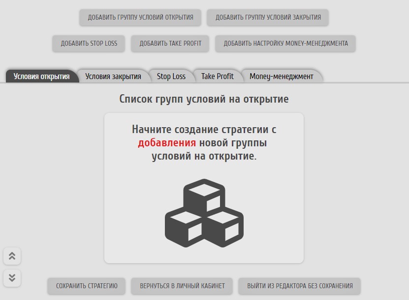После нажатия "Продолжить" будет создана пустая стратегия и откроется редактор. В нем и будет происходить задание торговых условий и настройка различных функций стратегии.