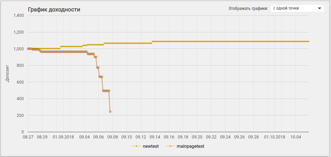 Также можно увидеть сводный график, у которого есть два режима отображения: в первом каждый тест будет начинаться со своей даты, во втором программа смоделирует результаты так, чтобы графики начинались из одной точки. Иногда это удобно для четкого понимания того, какой тест показывает лучшие результаты спустя месяц, год или любой другой отрезок времени.
