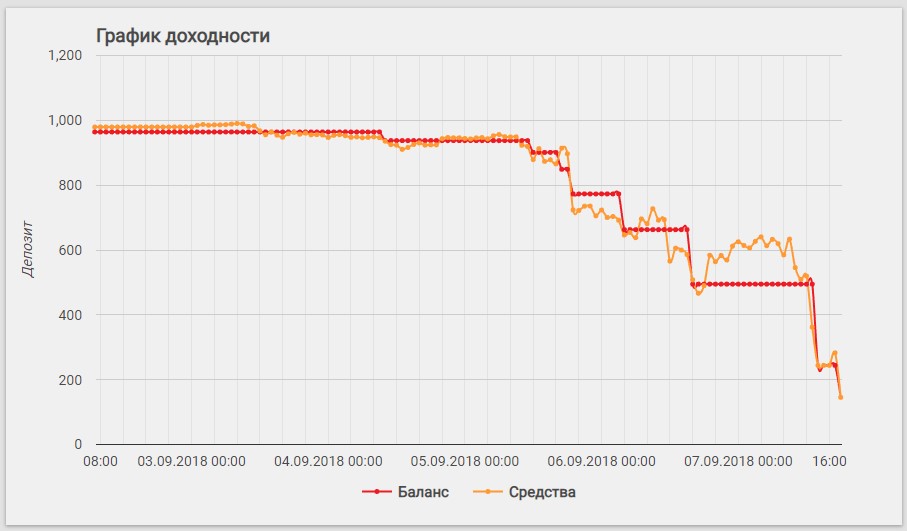 На странице с полным результатом тестирования в верхней части размещен блок с подробной статистикой. Ниже идет график, на котором можно увидеть баланс и средства в каждый конкретный момент времени (а не только в момент закрытия ордеров, как это реализовано в МТ4):